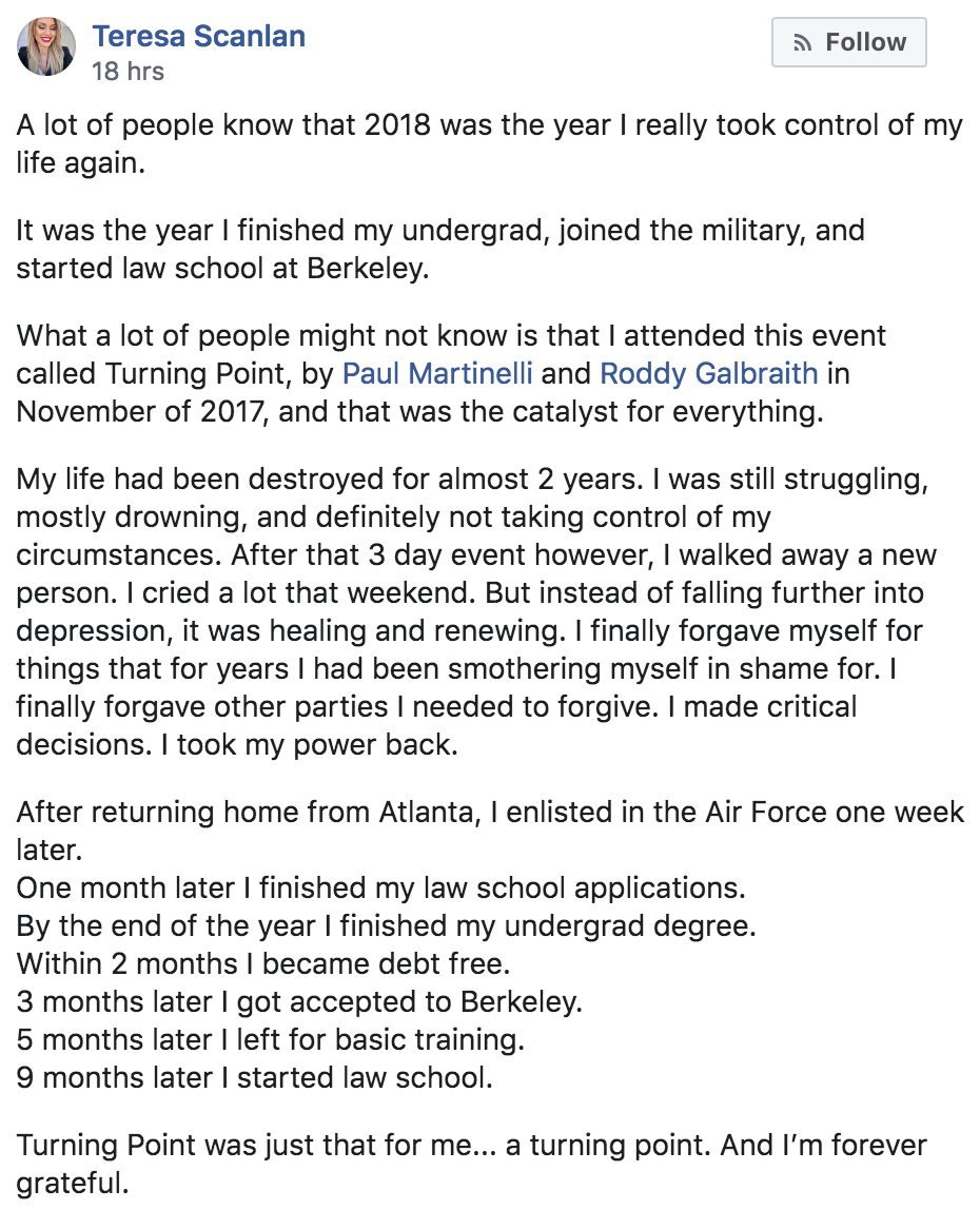 Join us in Colorado Springs, CO on May 31 - June 2 for a life-altering experience. This event is unique because this is up close and personal, live and in-person - an opportunity to be closely coached by Paul Martinelli and experience a different level of interaction and breakthrough. We will take you through this tried and tested process to get you to your Turning Point.